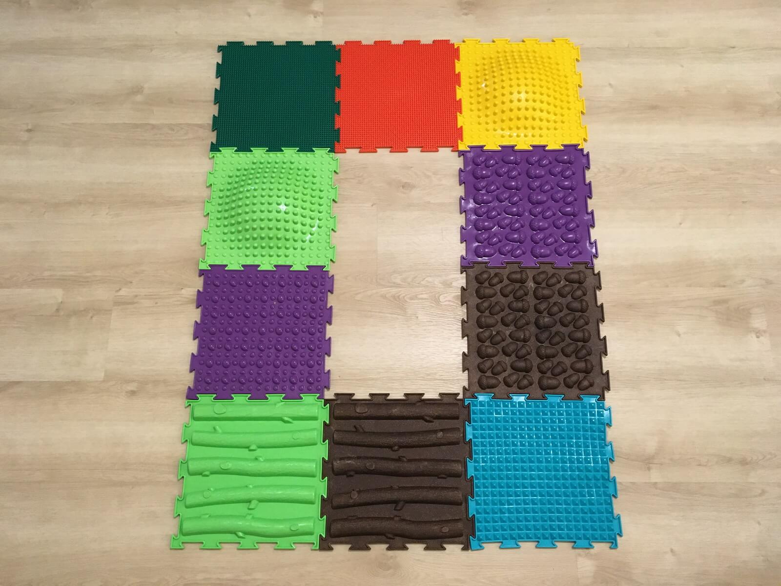Podložky majú rôzny stupeň tvrdosti. Pri tých tvaroch, ktoré sa v sade opakujú, je jedna podložka vždy mäkšia a druhá tvrdšia (a sú odlíšené aj inou farbou). Vďaka spájaniu ako skladačka puzzle si môžete poskladať koberček rôznej veľkosti a tvaru, vymyslieť si vlastné hry, aby najmä deti cvičili hravou formou a s radosťou.